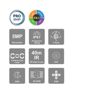 - Selectable output-5MP/4MP 4in1 (AHD / CVI – Excluding 5MP / TVI / CVBS + PAL/NTSC)