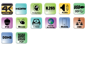 • Video:Input: 8 Channel Conventional Connection (1 x RJ-45 Network) SupportOutput: HDMI: 4K, 1080P, 1280×1024, 1024x768VGA: 1080P, 1280×1024, 1024×768
